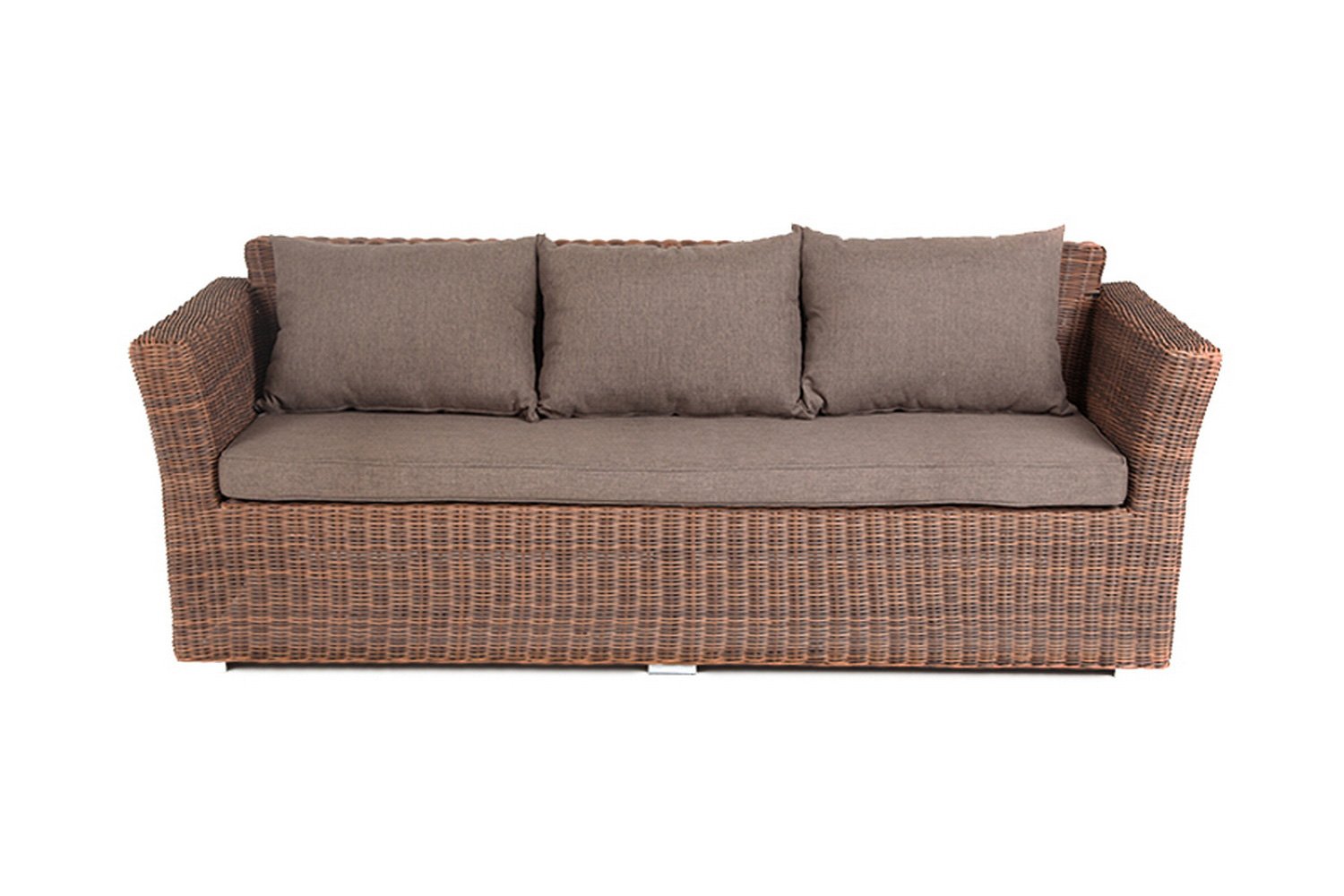 Отделка трехместного дивана Капучино выполнена с помощью переплетения искусственного ротанга коричневого цвета. Цвет отделки – коричневый, универсальный для любого интерьера, а ее материал позволит оставить диван на улице почти на все сезоны.
