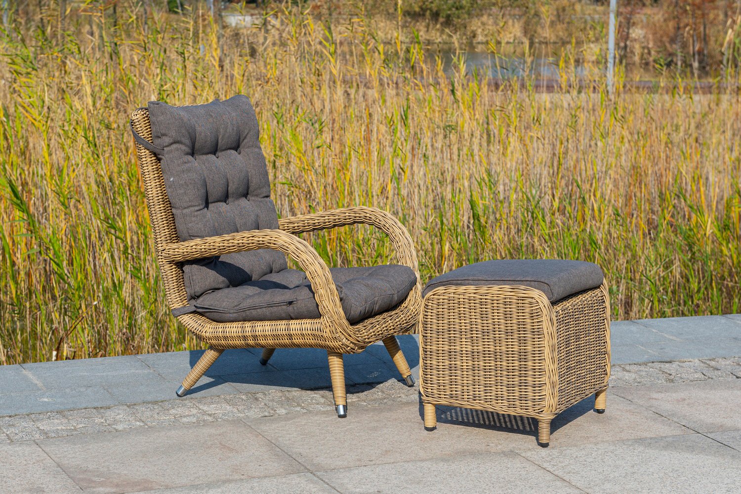 Кресло Толедо имеет необычную форму – короткие ножки и высокую спинку. Это достаточно низкая посадка, предназначена для сидения как можно ближе к земле, и отлично подойдет для чтения и любования природой. В таком кресле можно даже принять трапезу, если докупить к нему журнальный столик необходимой высоты.
