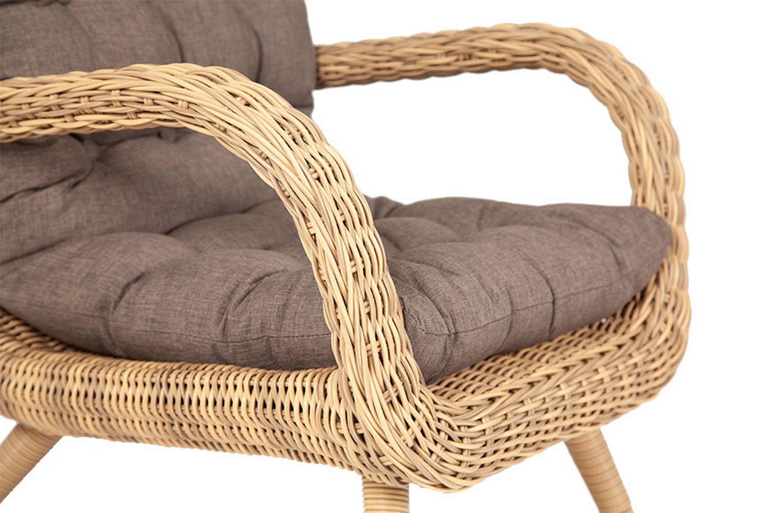 Кресло состоит из алюминиевого каркаса, покрытого оплеткой из искусственного ротанга соломенного цвета. У него высокая спинка и удобные подлокотники, габариты кресла 81х99х69 см. кресло Толедо может стать отличным интерьером для квартиры или беседки на даче.