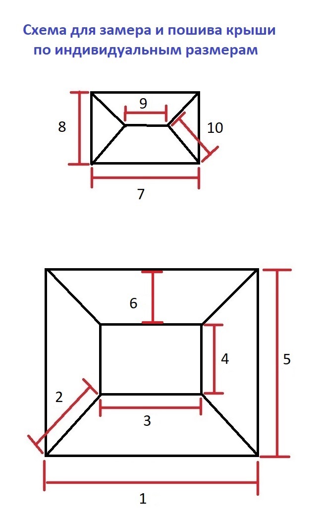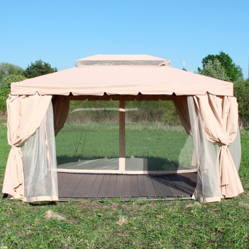 Тент (или же крыша) для уличной беседки имеет размеры: ширина 300 см, длина 400 см, высота 265 см. существуют возможность заказать крышу с дополнительной юбочкой с помощью дополнительных опций. Крепления крыши к каркасу – люверсы или липучки на выбор.