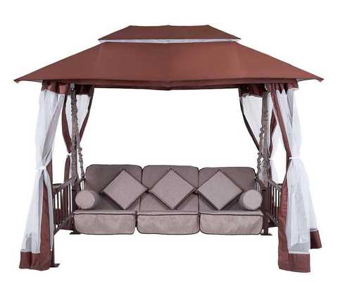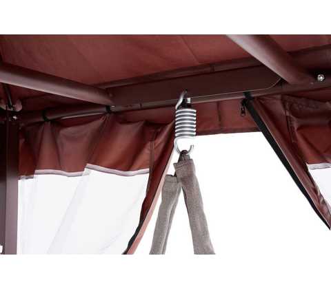 Тент-крыша, предназначенная для садовых качелей, надежно защищает от осадков и прямых солнечных лучей, от падающих веток и птичьего помёта, от выгорания краски-покрытия металлического каркаса, из-за чего летний отдых станет менее комфортным. Тент-крышу можно заказать вместе с противомоскитной сеткой.